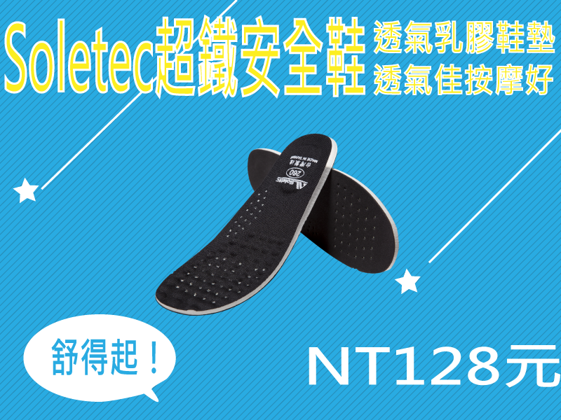 Soletec超鐵安全鞋-透氣乳膠鞋墊(透氣孔,按摩顆粒)