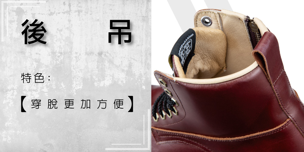 少見的中筒安全鞋為黏貼式的設計,整體防潑水,使用魔鬼氈快速穿脫。