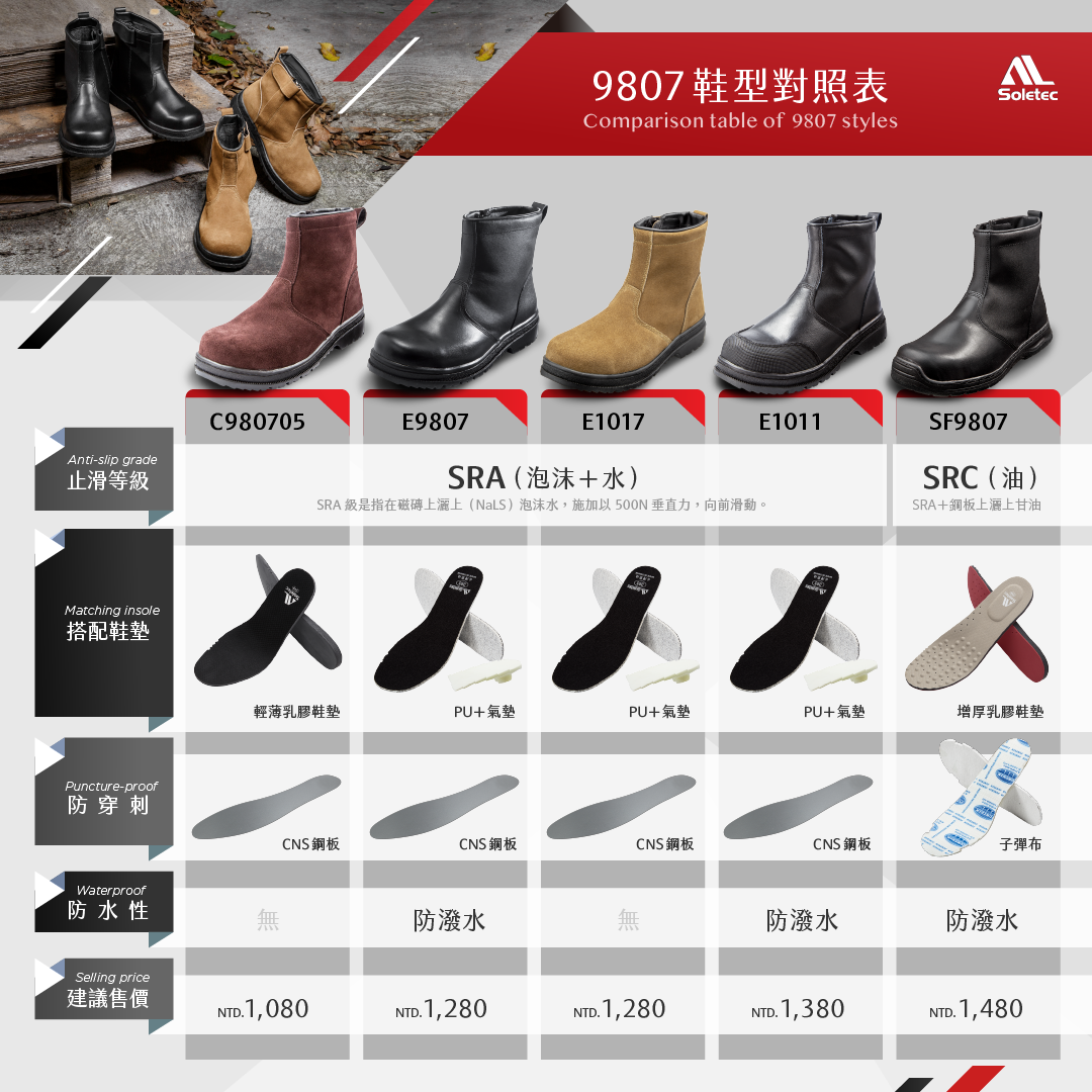 - CNS20345登錄型號:安全鞋面皮9807(SB-SRA-FO-E-HRO)第1類