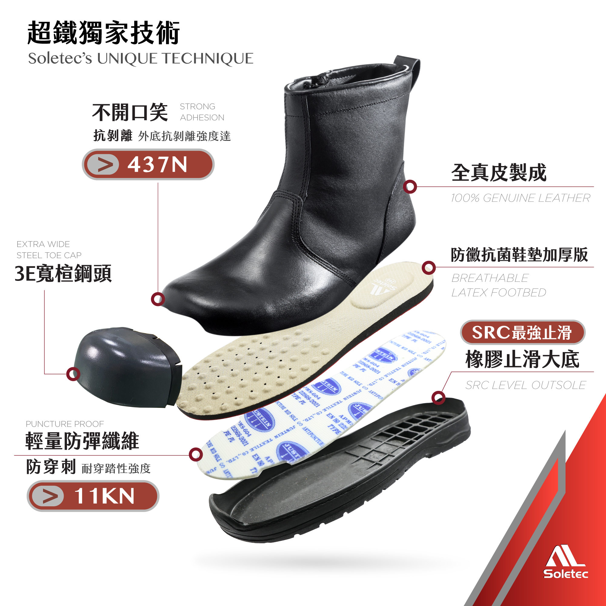 .Soletec的黑色皮面安全鞋表面僅防潑水,下雨天雖然不會馬上進水,但仍會濕透,請注意。