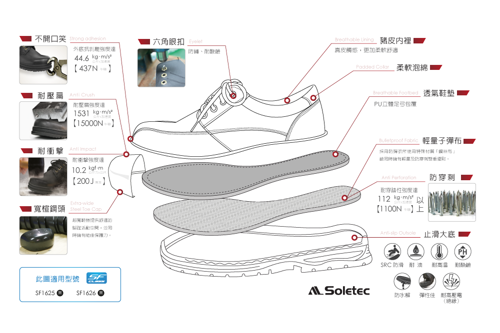 - CNS20345標示:安全鞋面皮1626(SB-SRC-FO-E-HRO)第1類