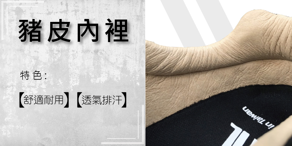 - 皮革:牛巴戈(此款安全鞋所使用之皮革容易吸附髒汙。)