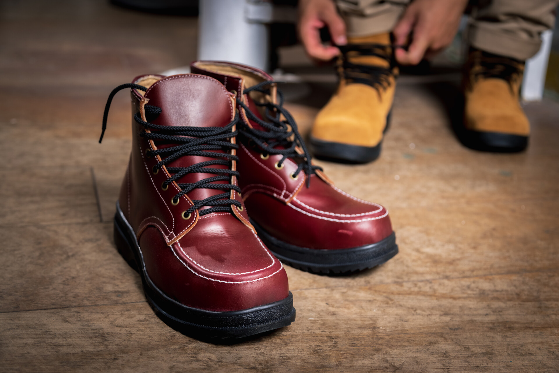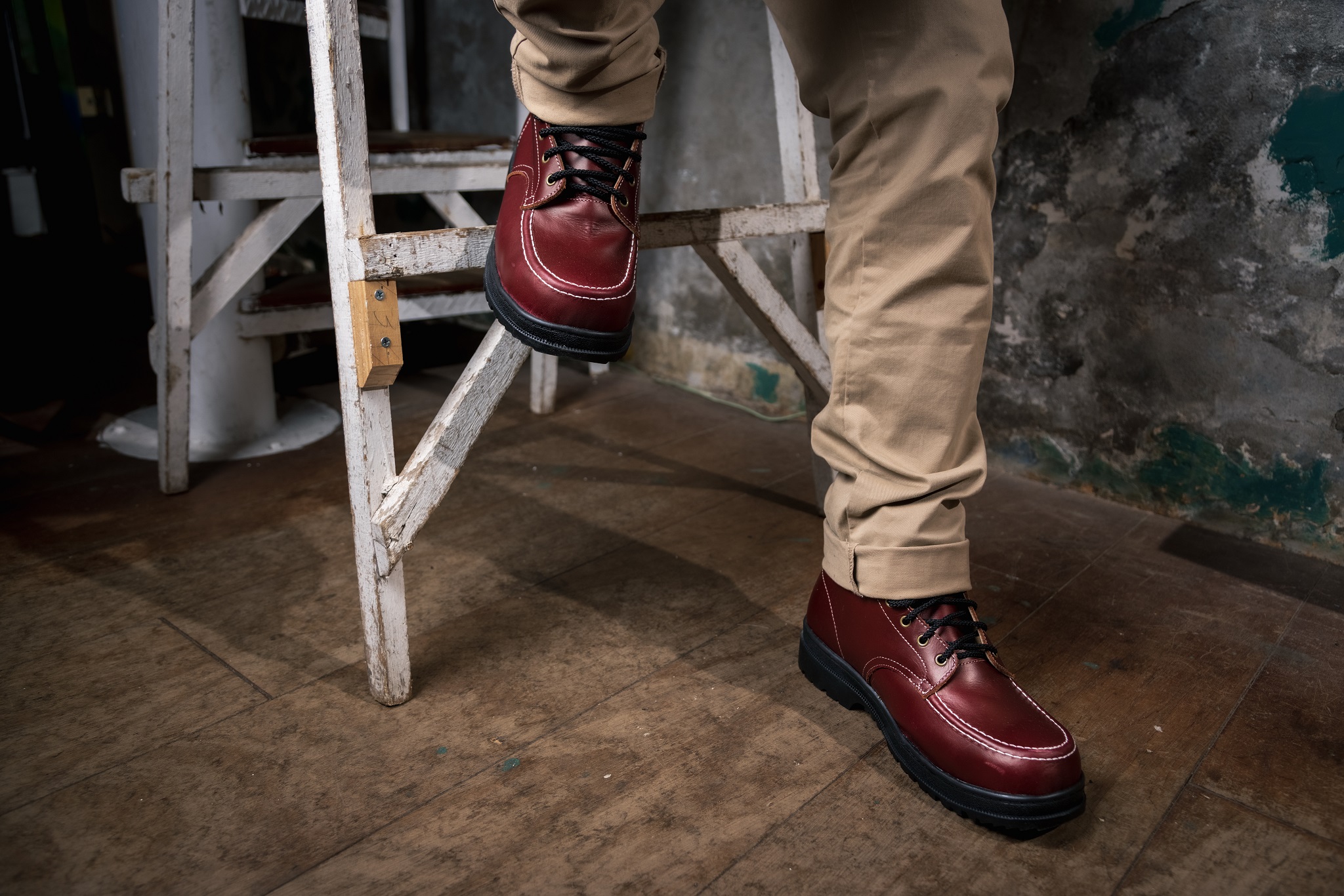 - 皮革:油蠟皮-酒紅色(此款安全鞋所使用之皮革較容易留下使用痕跡。)