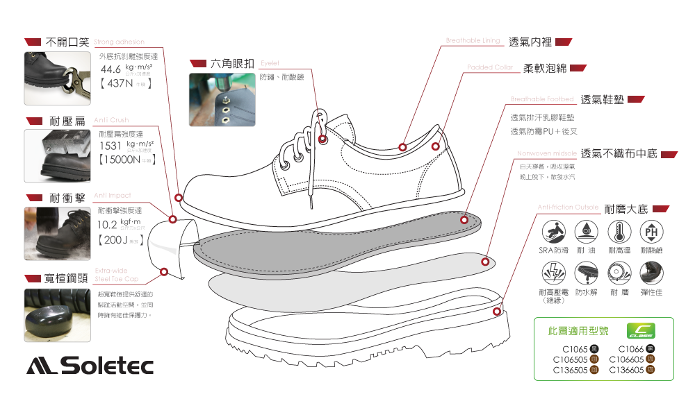 - CNS20345 系列型式:安全鞋榔皮1065(SB-SRA-FO-E-HRO)第1類